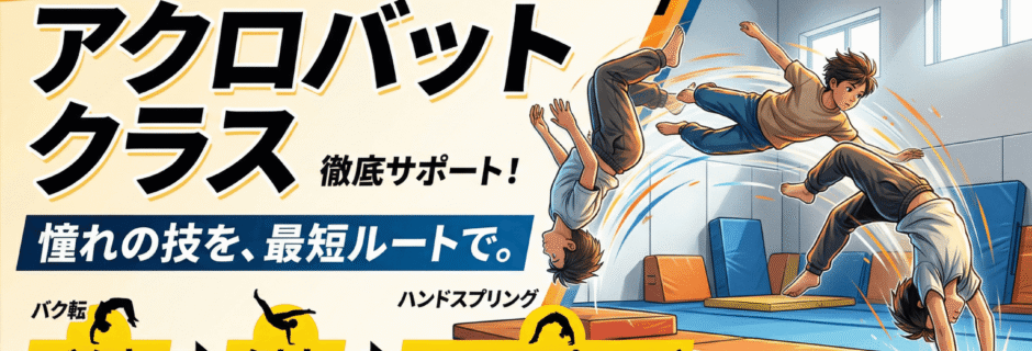 • 【1学期】バク転 (Back Handspring) • アクロバットの王道。まずはこの技で自信をつけます! • 【2学期】側宙 (Aerial Cartwheel) • 手をつかない華やかな側転。空中感覚を養います。 • 【3学期】ハンドスプリング (Front Handspring) • 前方へのダイナミックな回転技。1年間の集大成です。| クラス種類 | 特徴・内容 |