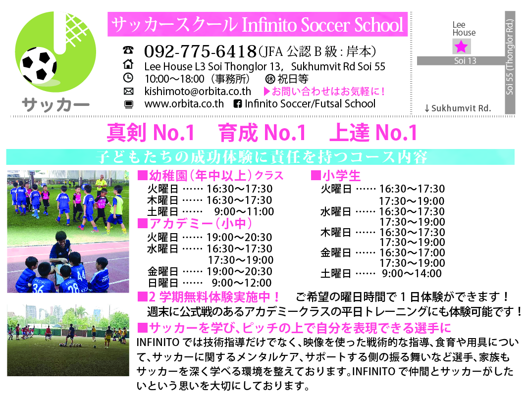 「個のスキルアップ」「人間教育」「自立」をテーマに、世界に通用する選手を育成。一人ひ とりを大切にする質の高い指導は、皆がサッカーを楽しみながら、勝利と育成の両立をも果た します。ライフキネティック、ピリオダイゼーション等、ヨーロッパの最新トレーニングと 「インフィニト独自」のトレーニングを実践。 得意なスポーツがあるということは、素晴らしいこと。そこから人間の交流も広がるし、 大人になればサッカーを通した仲間も出来る。サッカーは、決して今だけの習い事でなく、 子どもたちの未来を作り、幸福を築くためにあります。 インフィニトでは、プロサッカー選手養成アカデミー、幼稚園クラス、中学生クラス、 親子サッカー、大人サッカー、クラブ対抗戦等も開催しており、クラブ員全員に試合やイベント参加のチャンスがあります。